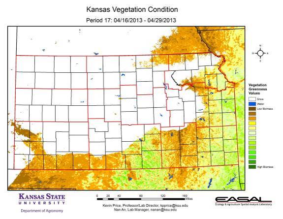 Map 2. Compared to the previous year at this time for Kansas, the current Vegetation Condition Report for September April 16 – 29 from K-State’s Ecology and Agriculture Spatial Analysis Laboratory shows that statewide biomass production is much below last year. In the Flint Hills, this is particularly noticeable. Growth of the grasses has be greatly delayed.