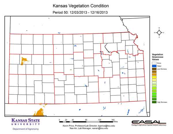 Figure 1. The Vegetation Condition Report for Kansas for December 3 – 16 from K-State’s Ecology and Agriculture Spatial Analysis Laboratory shows that most of the state had an early dusting of snow. Unfortunately, the liquid equivalent for the snowfall was limited. Statewide, the first half of December averaged just 9 percent of normal moisture.
