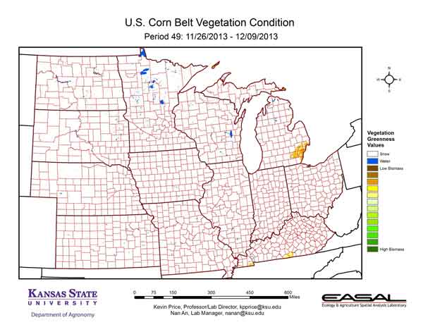Figure 4. The Vegetation Condition Report for the Corn Belt for November 26 – December 9 from K-State’s Ecology and Agriculture Spatial Analysis Laboratory shows that most of the Corn Belt had snow during the period. On the 9th of December snow covered the entire region, with amount ranging from a trace in southwest Kansas to as much as 20 inches in Michigan.
