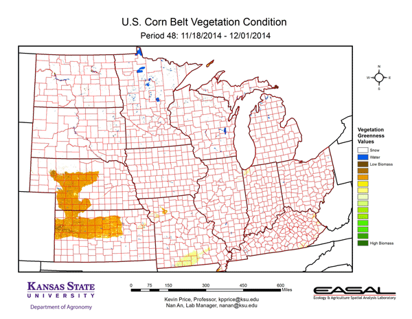 Figure 4. The Vegetation Condition Report for the Corn Belt for November 18 – December 1 from K-State’s Ecology and Agriculture Spatial Analysis Laboratory shows that snow covered most of the region. The exception was from the Sand Hills of Nebraska through west central and central Kansas. The heaviest snows were in the eastern portion of the Corn Belt region.