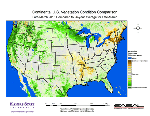 Figure 8. The U.S. comparison to last year at this time for the period March 17 – 30 from K-State’s Ecology and Agriculture Spatial Analysis Laboratory shows that the northern areas of the country have the greatest increase in photosynthetic activity. This is of particular concern, as the demands are likely to quickly exhaust available soil water resources.