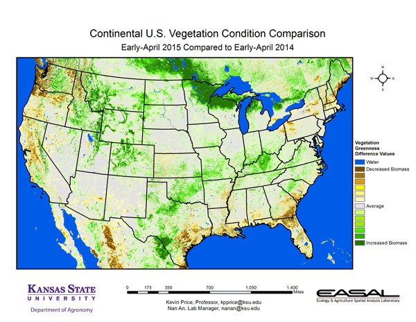 Figure 8. The U.S. comparison to last year at this time for the period March 13 – April 13 from K-State’s Ecology and Agriculture Spatial Analysis Laboratory shows that areas of lower photosynthetic activity are most noticeable along the coast of Washington and along the Gulf Coast from central Texas through northern Florida. These areas have seen higher precipitation. In the Upper Midwest, low snow amounts have resulted in higher photosynthetic activity.