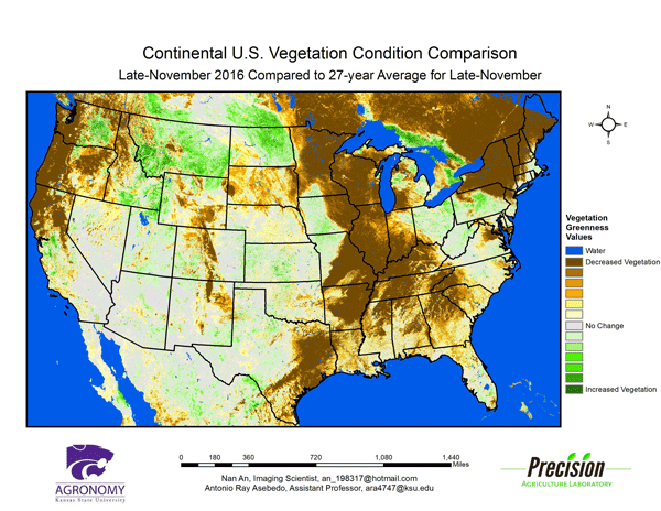 Figure 2. Compared to the previous year at this time for Kansas, the current Vegetation Condition Report for November 22 – November 28, 2016 from K-State’s Precision Agriculture Laboratory shows a band of higher NDVI values across parts of northwest Kansas. This area has had more precipitation than last year. Expanding drought conditions and the slow establishment of winter wheat in the Southwest into the South Central Divisions is visible as reduced NDVI values there.