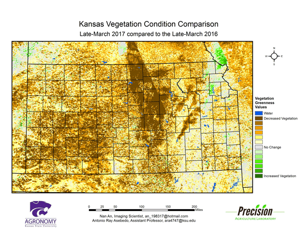 Figure 2. Compared to the previous year at this time for Kansas, the current Vegetation Condition Report for March 21 – March 27, 2017 from K-State’s Precision Agriculture Laboratory shows much lower NDVI values across most of Kansas. The winter wheat is less advanced this year than last, particularly in western Kansas, where dry fall conditions hampered establishment. In north central Kansas persistent cloud cover accounted for reduced NDVI values.