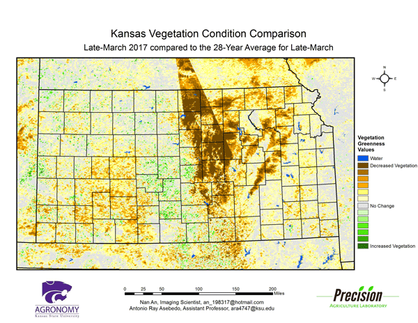 The Vegetation Condition Report (VCR) maps were originally developed by Dr. Kevin Price, K-State professor emeritus of agronomy and geography, and his pioneering work in this area is gratefully acknowledged.