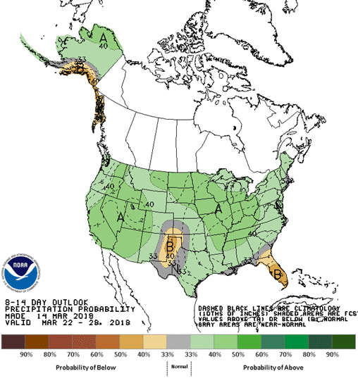 The quantitative precipitation forecast for the 7-day period, ending on March 22nd, is not very encouraging. The area with highest expected amounts of precipitation are along the Kansas/Missouri border in the northeast corner. (Figure 7). That region may see up to an inch and a quarter of rainfall. However, amounts drop sharply as you head west and south. From central Kansas to the southwest, the accumulation is expected to be less than a hundredth of an inch. The 8 to 14-day precipitation outlook (Figure 8) indicates a slightly increased chance of above-normal precipitation in the eastern third of the state, but areas that are in extreme drought are likely to see below-average precipitation. The temperature outlook is neutral for all areas except in the southwest, where there is an increased chance of warmer-than-normal temperatures, with the strongest signal in the southern portions of the state.