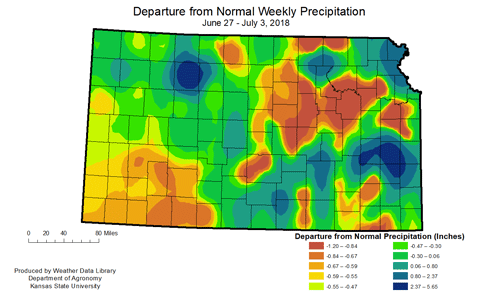 Figure 2. Departures of weekly precipitation from normal for Kansas during the week of June 27- July 3, 2018 via Cooperative Observer (COOP), Community Collaborative Rain Hail Snow Network (CoCoRaHS), and Kansas Mesonet.