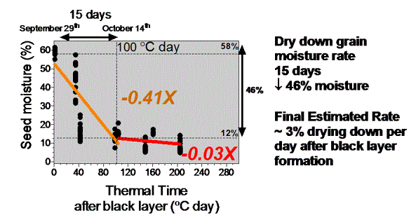 Changes in the water content during the seed-filling process (Figure 1) were previously described in our “Soybean Growth and Development” poster. As described for corn, seed water loss for soybeans can also divided in two phases: 1) before “black layer” or maturity, and 2) after black layer.