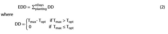 For winter wheat, the optimum temperature (Topt = 70°F) is consistent with GDD calculation. The EDD is a metric for estimating impacts that may occur under crop heat stress conditions (outside of optimum temperatures) for crop development and growth as well crop yields.