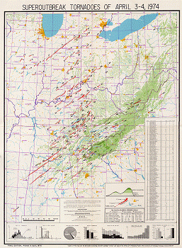 As we move into April, we move into severe weather season. April 3rd marks the 45 anniversary of one of the worst tornado outbreaks on record. On that date in 1974, a super outbreak of tornadoes ravaged the Midwest and the eastern United States. Severe thunderstorms spawned 148 tornadoes in 36 hours from Alabama to Michigan. Death toll during the outbreak was 315 persons, with another 5300 injured. Damages in the US totaled 600 million dollars, in 1974 dollars. That is approximately 3.3 billion dollars at 2019 values. There were over 30 F4/F5 tornadoes, and as many as 15 tornadoes on the ground at one time. Half the town of Xenia, Ohio was destroyed and 34 people were killed.